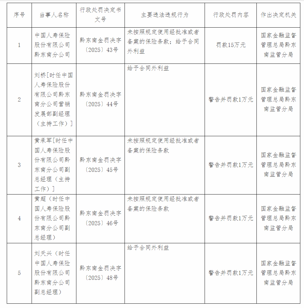2025年末,中国人寿保险股份有限公司黔东南分公司及其下辖机构因多项违规行为连续收到国家金融监督管理总局黔东南监管分局的行政处罚,罚单总金额达25万元股票配资哪儿好,涉及分公司及黎平支公司共6名管理人员。