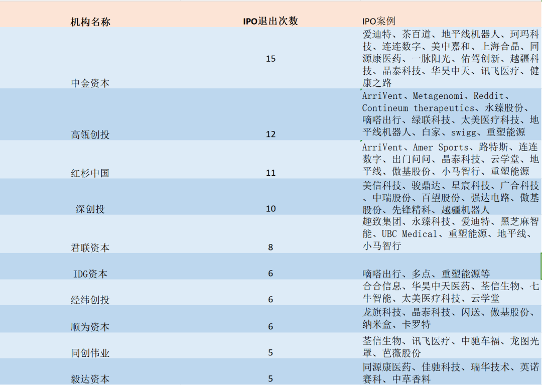 哪怕在这样的环境下仍有一批取得优秀成绩的投资机构。其中,中金资本以15个IPO的成绩位列今年机构IPO退出榜首,并且在其IPO成绩单中不乏茶百道、地平线机器人、连连数字、爱迪特等优秀企业;高瓴创投以12个IPO排名第二,投出了包括嘀嗒出行、绿联科技、太美医疗科技、地平线机器人等行业龙头;红杉中国以11个IPO排名第三,投出了小马智行、重塑能源、星宸科技等优秀企业;深创投以10个IPO数量排名第四,其中包括美信科技、骏鼎达、星宸科技、广合科技等;君联资本投出了地平线、黑芝麻智能等,以8个IPO数量排名第五。