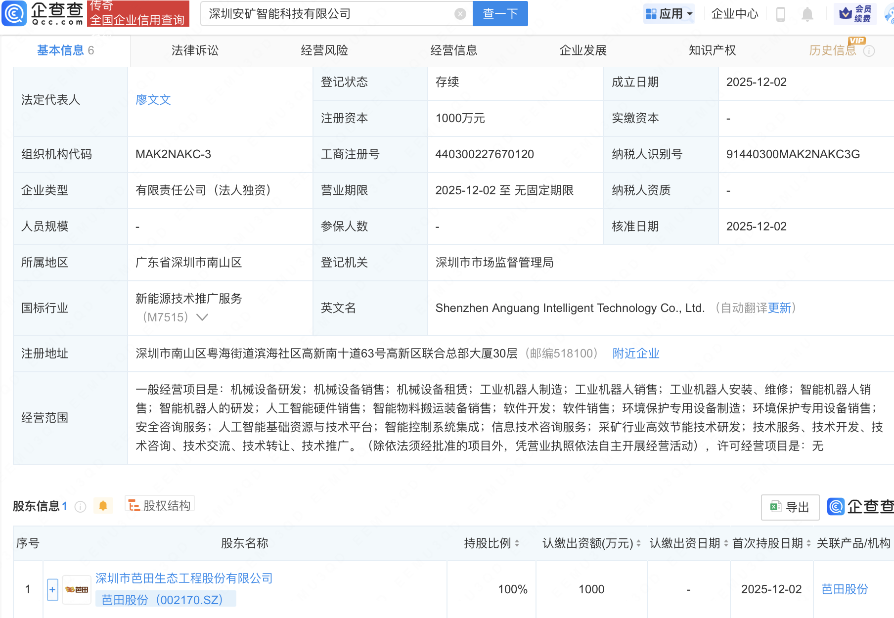 近日炒股配资软件,深圳安矿智能科技有限公司成立,注册资本1000万元,经营范围包含:智能机器人销售;智能机器人的研发;人工智能硬件销售;智能物料搬运装备销售等。企查查股权穿透显示,该公司由芭田股份(002170)全资持股。